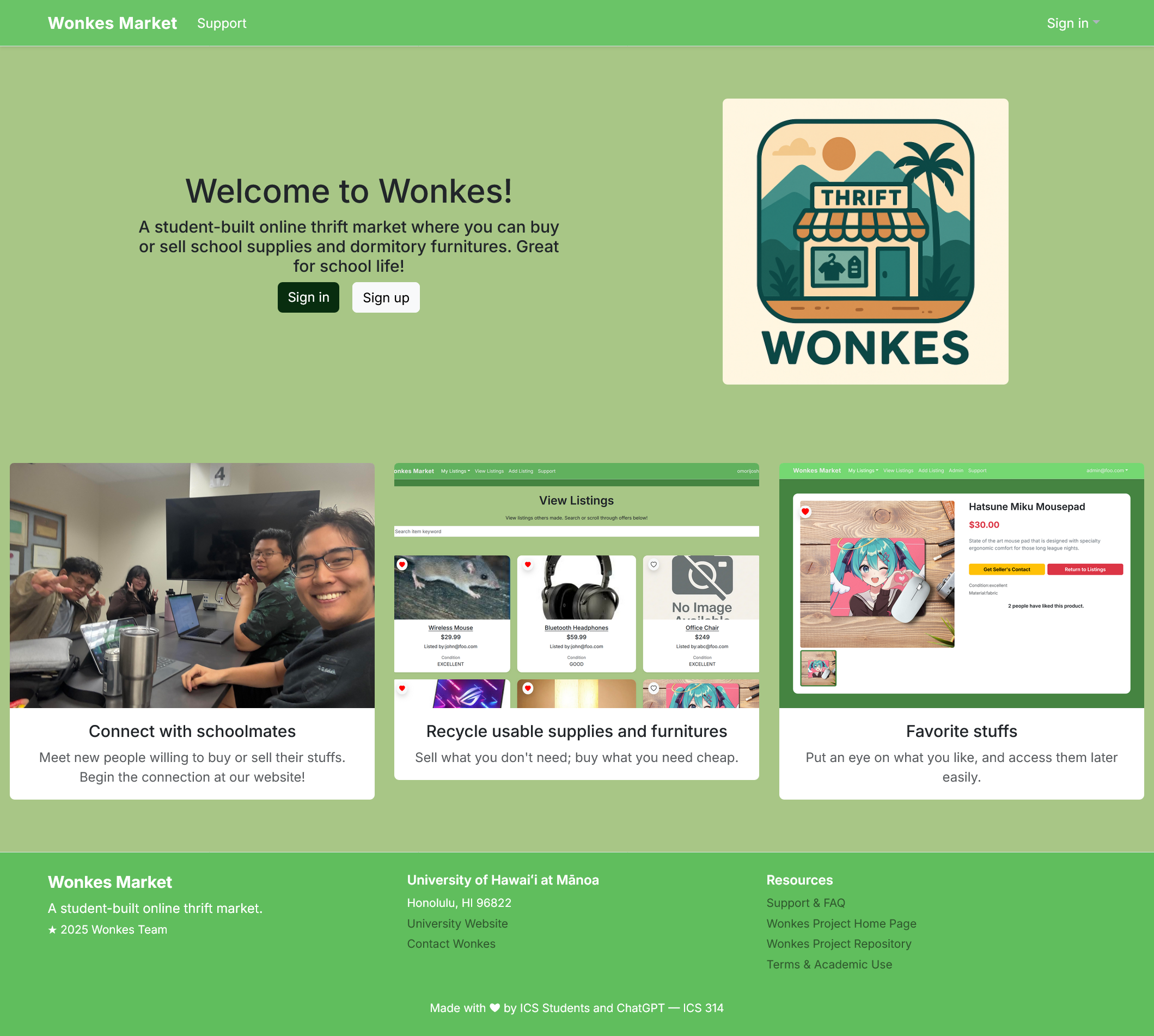 Wonkes Manoa is an online marketplace designed specifically for UH Mānoa students. The goal was to create a platform where students could quickly buy and sell campus-related items in a simple and accessible way.